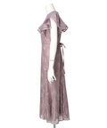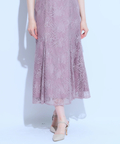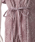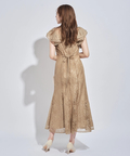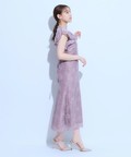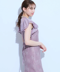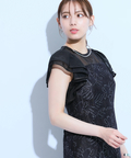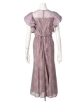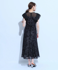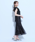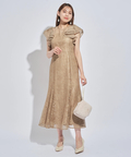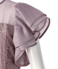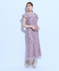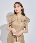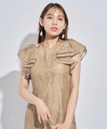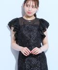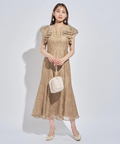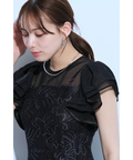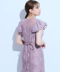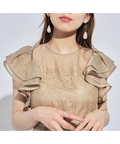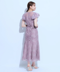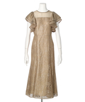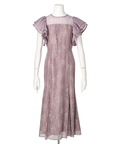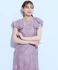 ティアードフリルのフレアスリーブが愛らしいポイント。上品な輝きを纏う繊細なレース使いがラグジュアリーなムードを漂わせるドレスです。