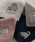 愛らしいネコの刺しゅうを胸にあしらったタオルハンカチ。