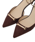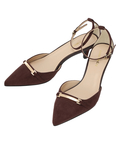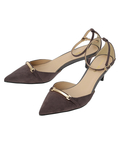 つま先の尖ったポインテッドトゥのデザインが華奢な印象を与えるパンプス。程よい高さのローヒールなので、自然なスタイルアップ効果を演出します。アッパー部分のメタルパーツがさりげないアクセントに◎ワンピースやパンツスタイルなど、あらゆるボトムスと相性の良いアイテムです。