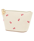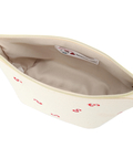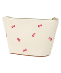 リボン刺しゅうが散りばめられた総柄デザインのポーチ。