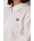胸元のエンブレム刺しゅうがさりげないワンポイントになるシャツブラウス。