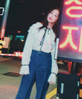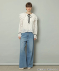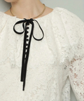 軽やかな透け感が女性らしさを引き立て、首元のリボンがアクセントに。