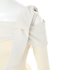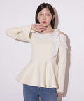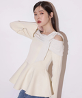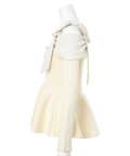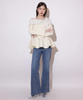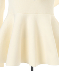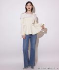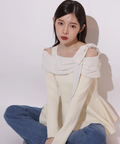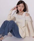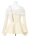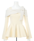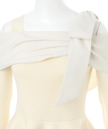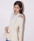 大きなリボンをあしらったオフショルデザインが視線を惹くドッキングニット。