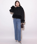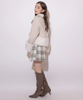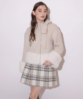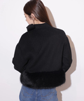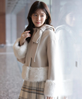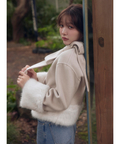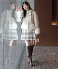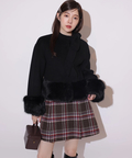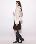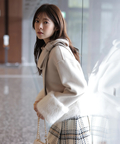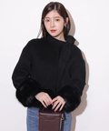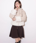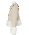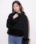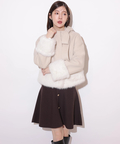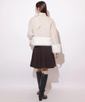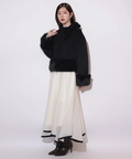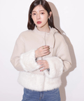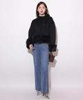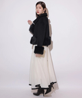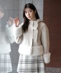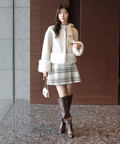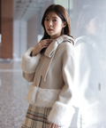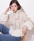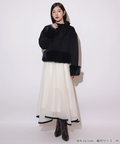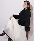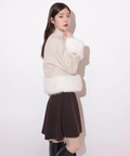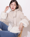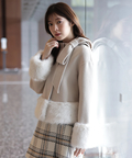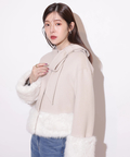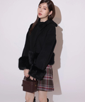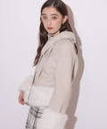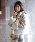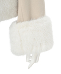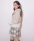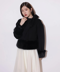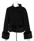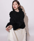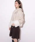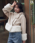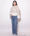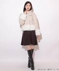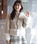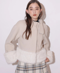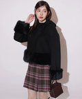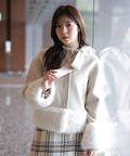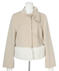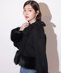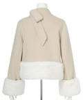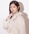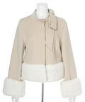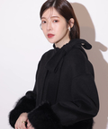 首元のリボンとふわふわのファー調ディテールが女性らしさを引き立て、羽織るだけで華やかな印象に。