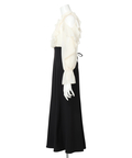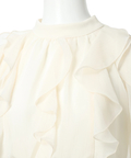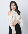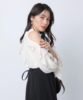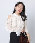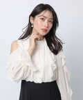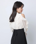 ショルダー部分のスリットとフリルデザインが華やかな印象を添えるワンピース。