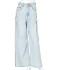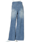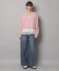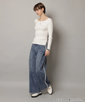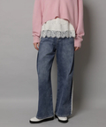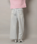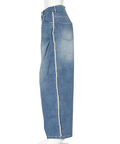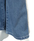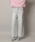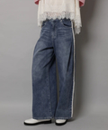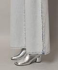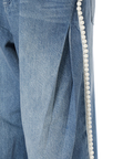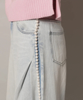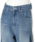 サイドラインに並んだパール風モチーフがポイントのデニムパンツ。