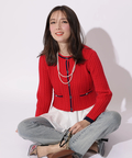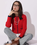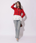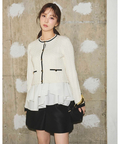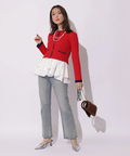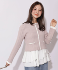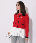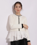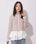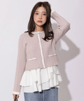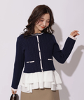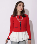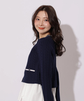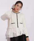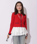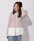 配色ラインが映えるケーブルニットと、ティアードデザインを組み合わせたアンサンブル。