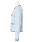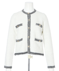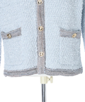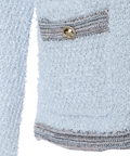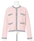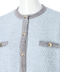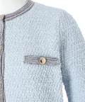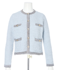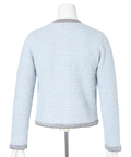柔らかな配色のツイード素材が、装いに明るさを添えるノーカラージャケット。
