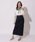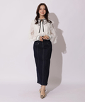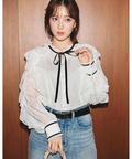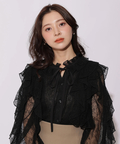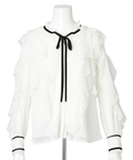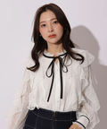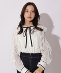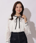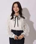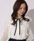 繊細なレース素材にボウデザインをあしらい、華やかさと上品さを兼ね備えたブラウス。