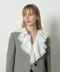 ひらりとしたネックラインのフリルがフェミニンなムードを高めるラッフルブラウス。