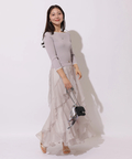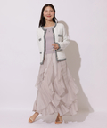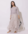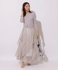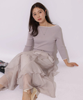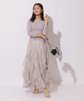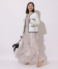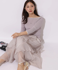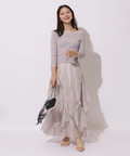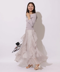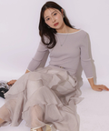 女性らしいタイトなトップスから、花びらが舞うように華やかに揺れるボトムスの絶妙なバランスが優美な雰囲気に。