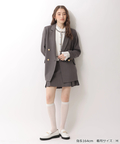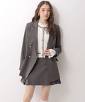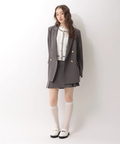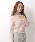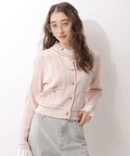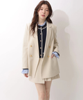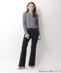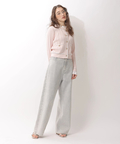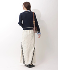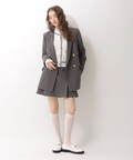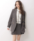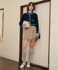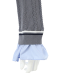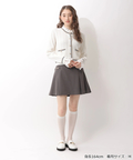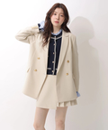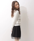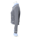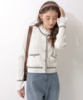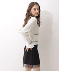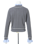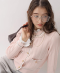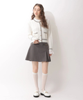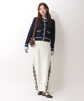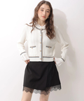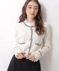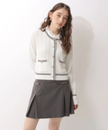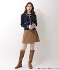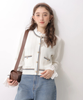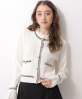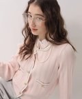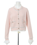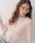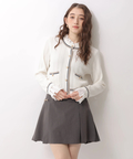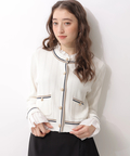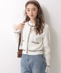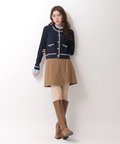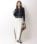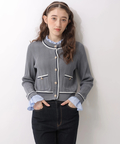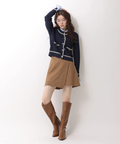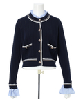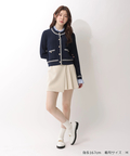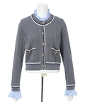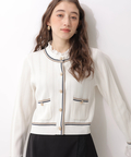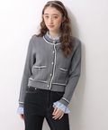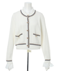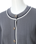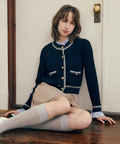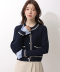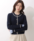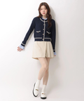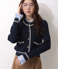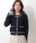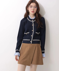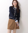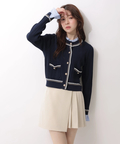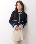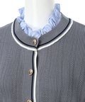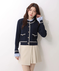 ベースのニットは、クラシカルな配色のパイピングと金ボタンがアクセント。
