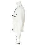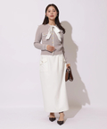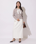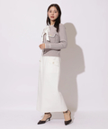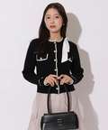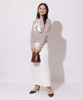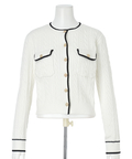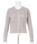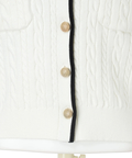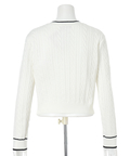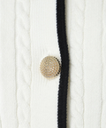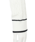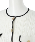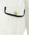 立体感のあるケーブル編みがボディラインに沿いすぎず、配色パイピングでシルエットにメリハリをプラス。