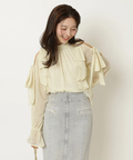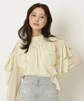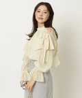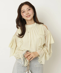 ふわりと重ねたフリルと袖リボンが華やかさを演出します。