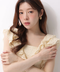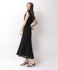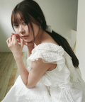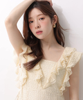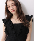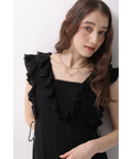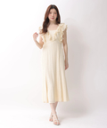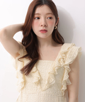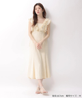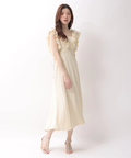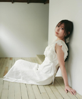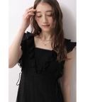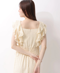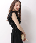 肩から流れるフリルとウエストのリボンディテールが、やわらかな女性らしさを引き立てます。