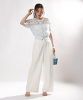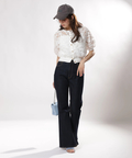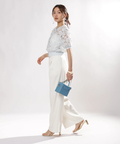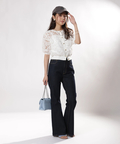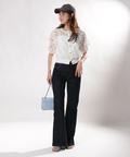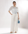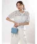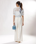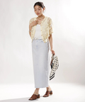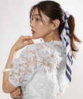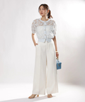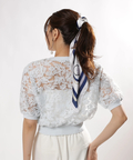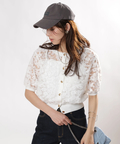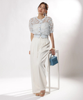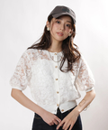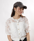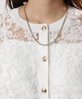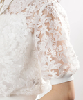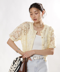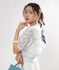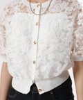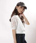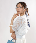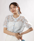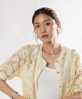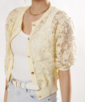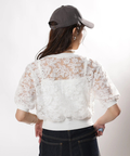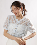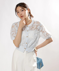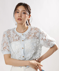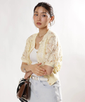立体的なフラワーレースを重ねた華やかな表面感が目を引く、コンパクトなカーディガン。