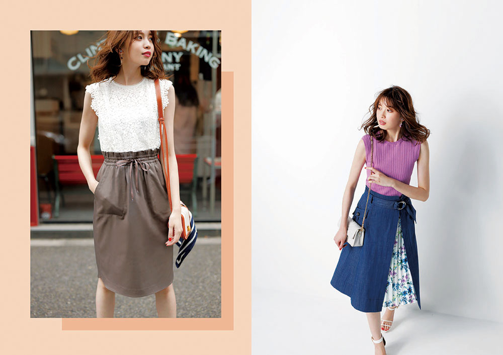バックリボンパールノースリニット ¥9,800 + tax サイドプリーツワンピース ¥21,000 + tax ITEM CHECK