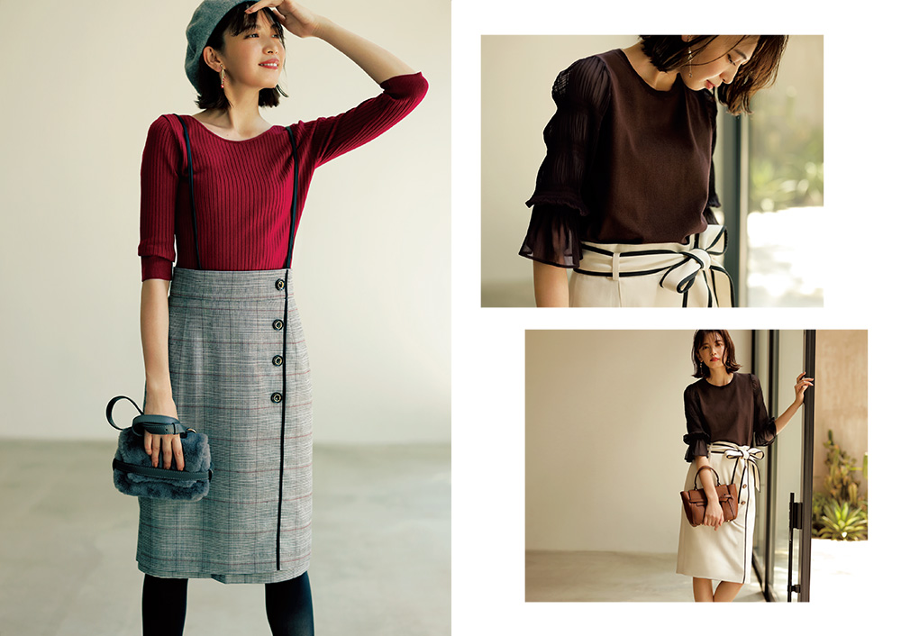 スカーフ付シンプルリブニット ¥12,000 + tax BACKリボンサロペット ¥22,000 + tax ITEM CHECK
