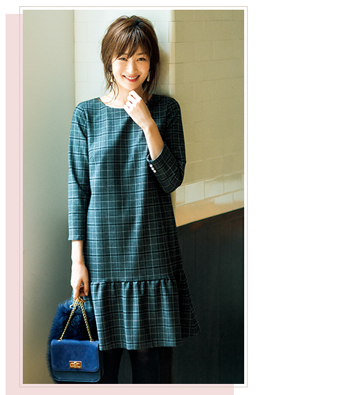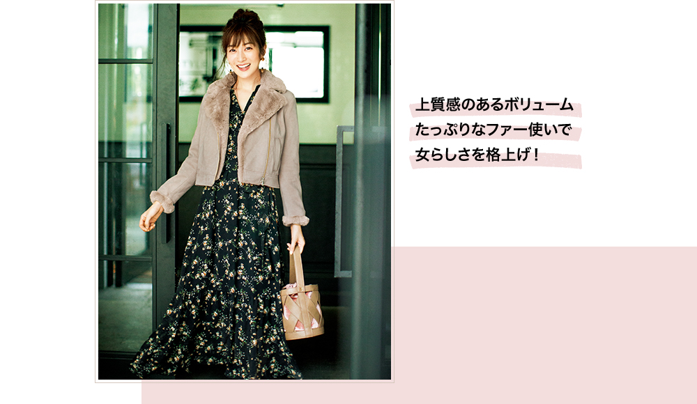 フェイクスエードブルゾン ¥23,000 + tax 花柄ロングワンピース ¥25,000 + tax