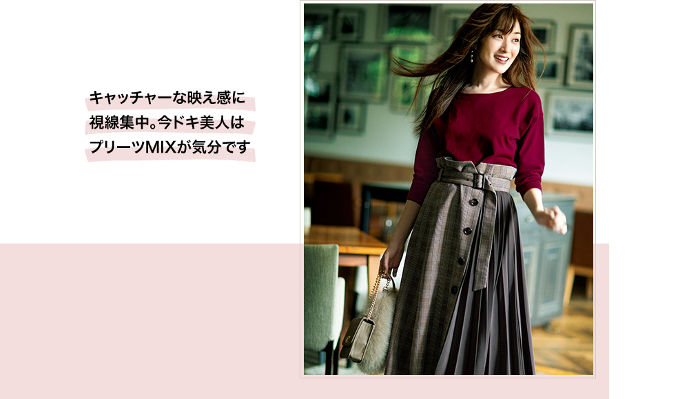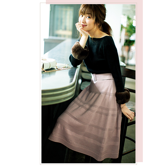 前後2WAYドルマンニット ¥13,000 + tax プリーツアシメフレアスカート ¥24,000 + tax